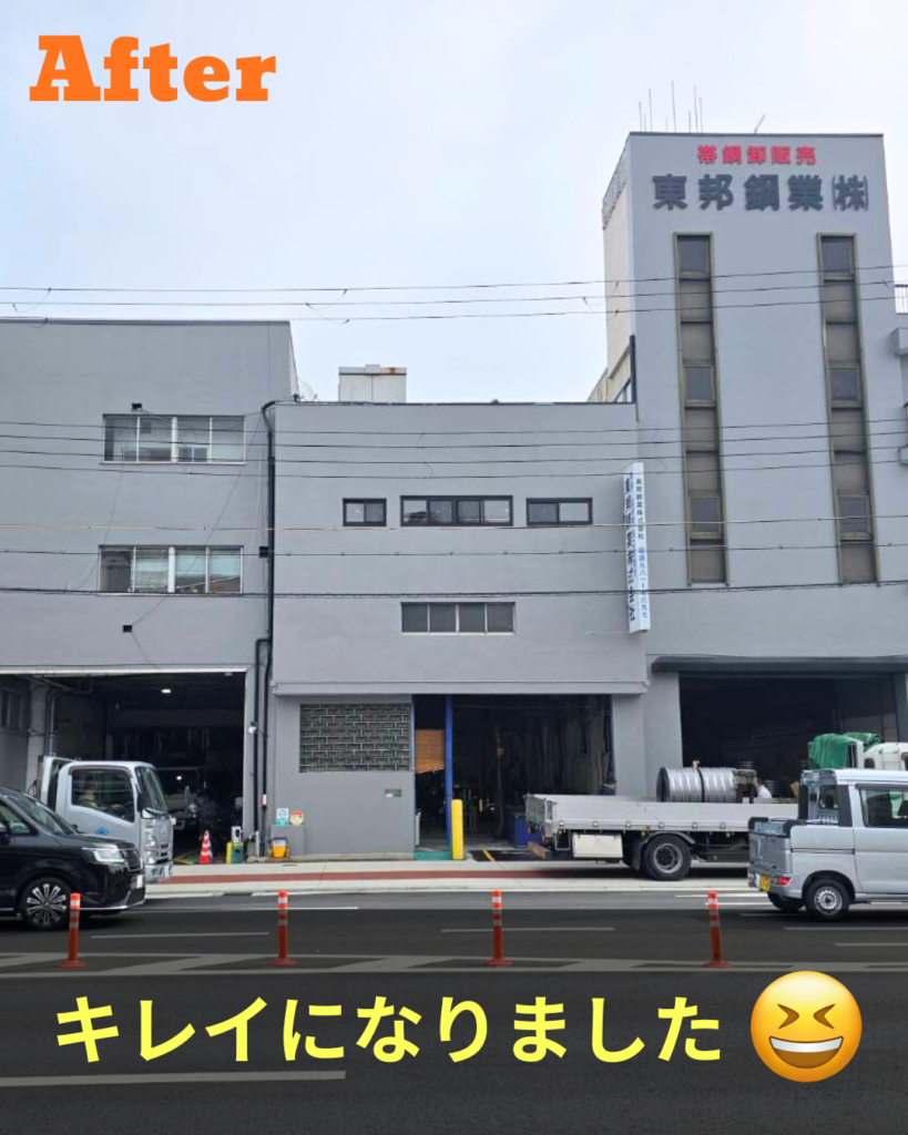 お知らせ 外装塗装 2026.02.20 by 河野 大阪市東成区で鋼材の販売加工50年の東邦鋼業です。この度ビルの外装塗装を行いました!ぜひ、Before-Afterをご覧ください☺️鋼材やコイルラックのご相談はお気軽に✋️ 鋼材を小ロット・小割にて販売大阪より全国へ配送いたします。 お問い合わせはこちら